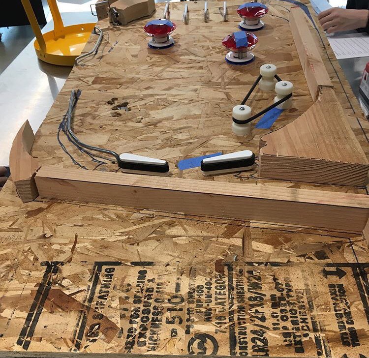 What we did is make a pinball machine. How it works is that there is a shooter which is where the ball starts and where you will launch it into the play field where everything in the game will happen. There is the flippers which you use to keep the ball in play, and hit the ball into the slingshots and the pop-bumpers. The pop-bumpers and slingshots are what you score points on and what launches the ball all over the place. The main objective of the game is to hit the bumpers and slingshots as many times as possible, to score as many points as you can.