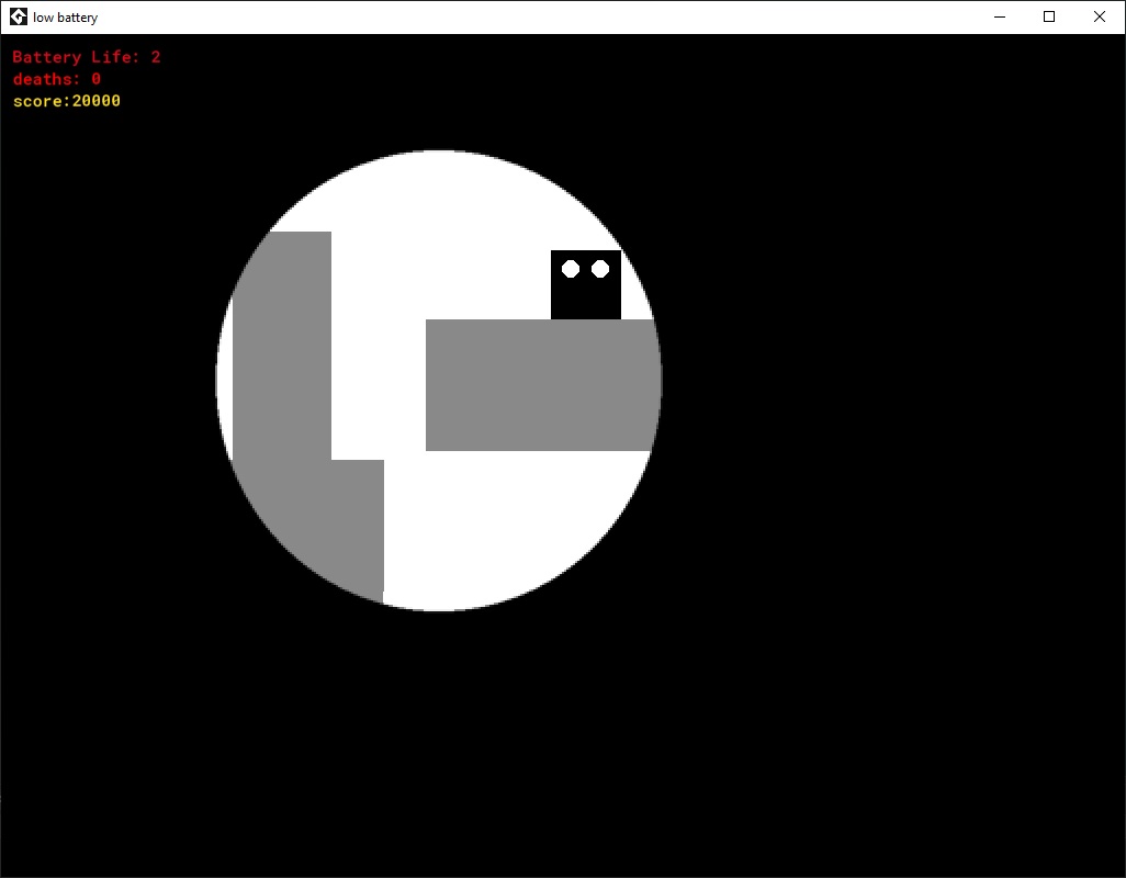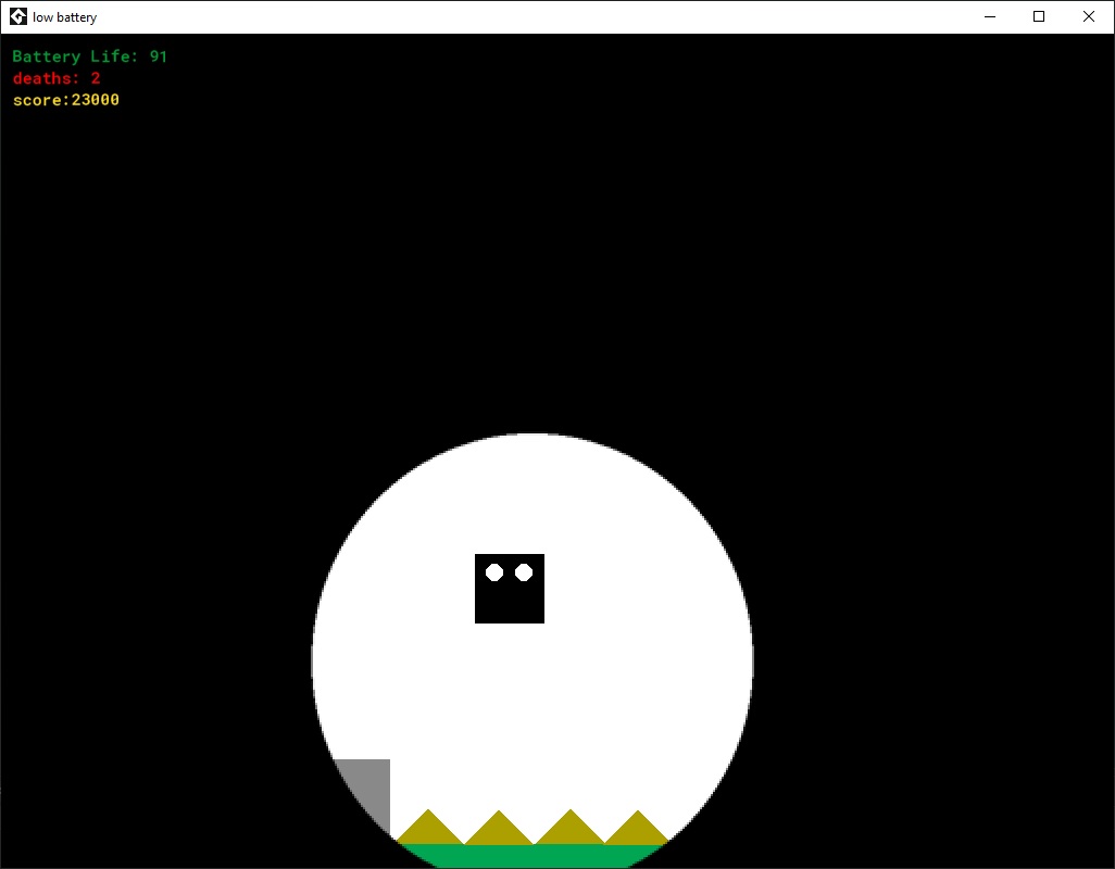 Our game Low Battery is about a cube that travels through different levels. The levels range in difficulty as you progress. There are different obstacles throughout the levels including jumps, spikes, bats, and lasers. The cube moves through the cave with a flashlight. The flashlight's battery decreases at each level. To pass each level the cube must collect gems and at the end of the game, the cube collects a trophy.