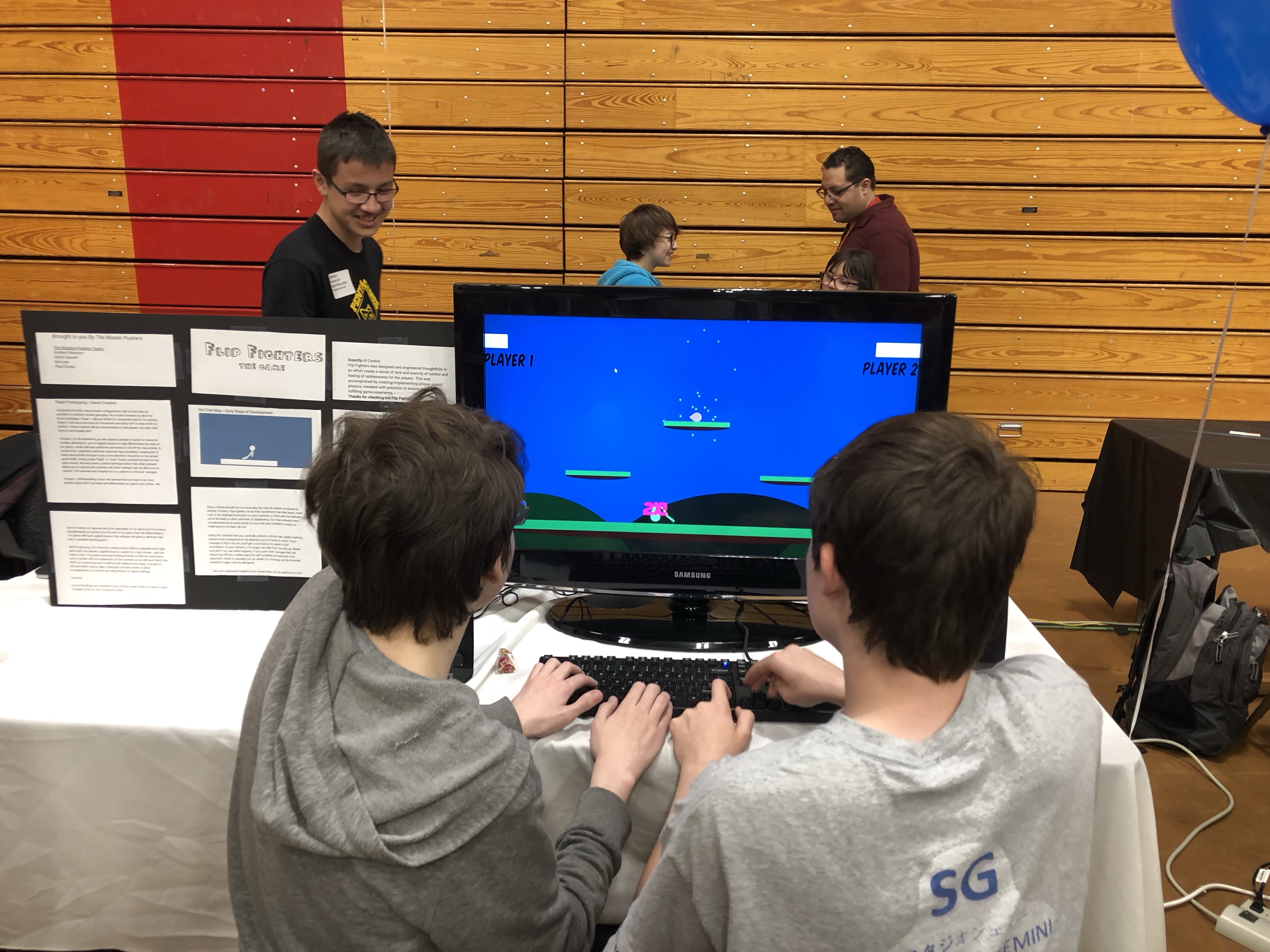 Grab a friend and tell 'em to come play the new hit classic produced by Master Pushers: *Flip Fighters*. Once their excitement has died down, head over to the keyboard and pick out your controls, or stick with the defaults we've decided on after centuries of playtesting. Our map artisans have homebrewed some spicy levels for you and your buddies to enjoy, so make sure to try them all out!