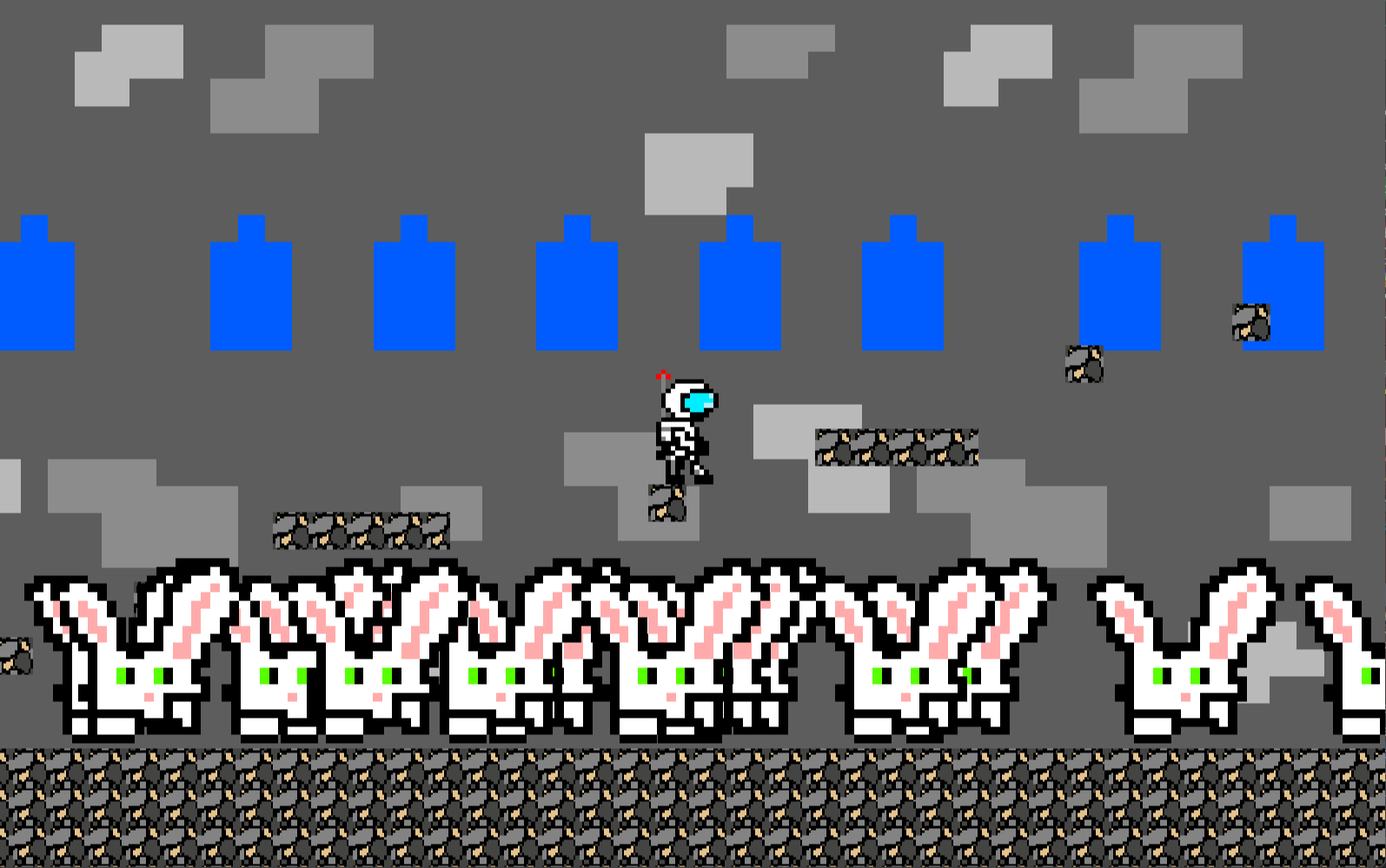 Use left and right arrow keys to move around, and up arrow or space bar to jump in the air. Don't touch the purple part of the cacti, but you can touch the green part. Stomp on bunnies to not kill them, but instead send into pods in the air. They are innocent and fell under the evil spell of the weather wand cast by Bunny Lord. But, you should kill the ferocious fire and ice minions that roam Mars by the same way you'd save the bunnies. However, they do shoot fireballs and icicles, so watch out! That is all.