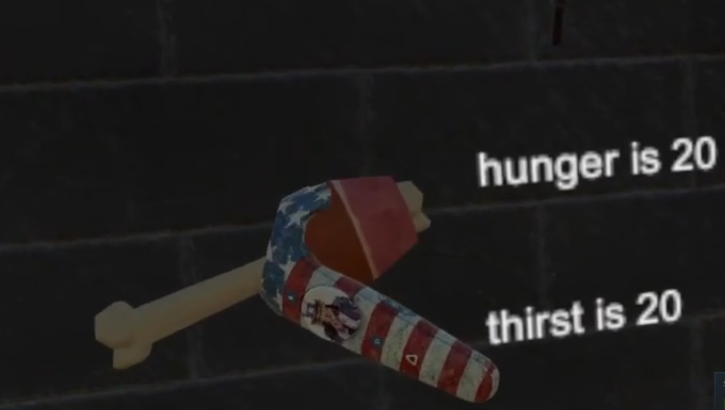 After the introduction you are in a dark room with a yellow button on the wall. This button transfers you into a different room called the collection room. In this room you only have 20 seconds to throw items into the portal to be put in the original room you are in. When you are in the original room you have your stats displayed on the wall telling you how much time you have left to drink or eat.